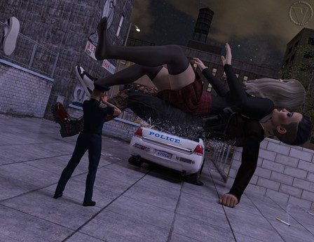 Suddenly the girl lifted her legs. The Policeman quickly reacted as he realized she was going to step on him.