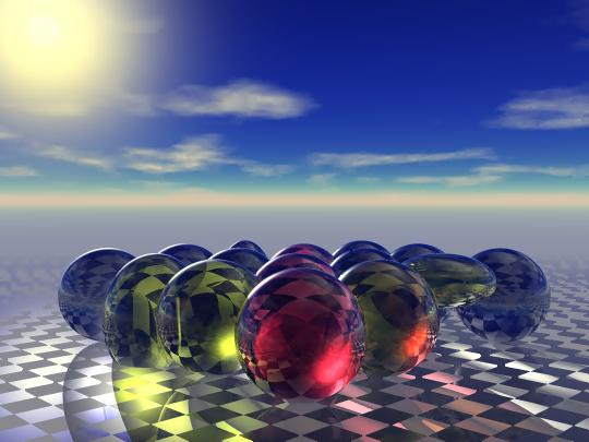 Like this art work very much, especially the backround is very good, maybe the light reflection on the balls could be better and a shadow of them on the ground would be nice.