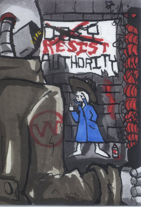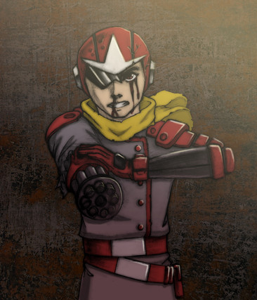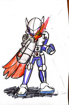 This is not based on the character Protoman from the Megaman game series it is based on THE PROTOMEN. [link] the most awesome band ever. This scene is Protoman making a final stand against the overwhelming hordes of Wily's robots. I used copics in strong primary colors and muted grays for contrast, and really took my time on the detail to make him look like he's just been on the ass end of an ass handing."And as the smoke cleared, Wily rose above the countless robots remaining. Protoman was wounded, low on energy, struggling to remain standing as Wily ordered the final attack...The death...of Protoman.