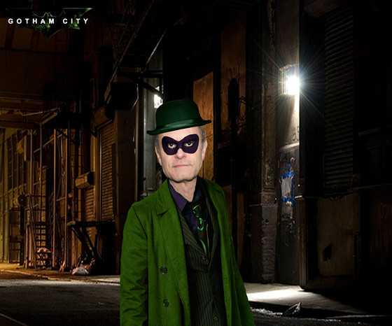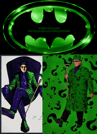And here's another character fan poster I did on Batman Forever, and this time, is for Robin Williams as The Riddler. When the Batchlers bring in The Riddler, they deciding that he's Bruce Wayne's enemy. They made him as this guy who works for Wayne Enterprises and he was a fan of Bruce Wayne, and the word fans came from the word fanatic, because someone who's a fan of novelists like Stephen King, Dean Koonz, John Grisham, and Stephanie Meyer, film stars like Danny DeVito and Arnold Schwarzenegger, television stars like Nina Dobrev, Candace Accola, Kat Graham, Hilarie Burton, Sophia Bush, Bethany Joy Lenz, and Jamie Lynn-Sigler, and rock bands like Siouxsie & The Banshees, U2, The Cure, and INXS, you knew that you worship them. And when Bruce rejects, Riddler comically becomes Bruce's nemesis, like to outsell him by using businessmen tools, and sending him riddles.In the first two drafts written by the Batchlers, they gave Riddler the name of Lyle Heckendorf, not Edward Nygma (Akiva Goldsman later uses the Edward Nygma name in the subsequent drafts). His company was not NygmaTech. His name was Lyle Heckendorf. The Batchlers came up with a scene that was not in the final film where Lyle tests The Box on his former landlady. And Joel, who starts out as a costume designer because costumes matter to him, came up with a scene that's also not in the final film where Lyle stalks Bruce Wayne and Chase Meridian at the circus, where they're about to see The Graysons die. And in order to get closer to Bruce, Lyle stole clothes from a fortune telling leprechaun, which form the basis of the Riddler outfit, and he has magenta hair.