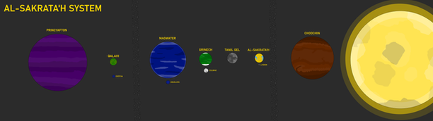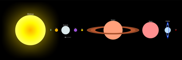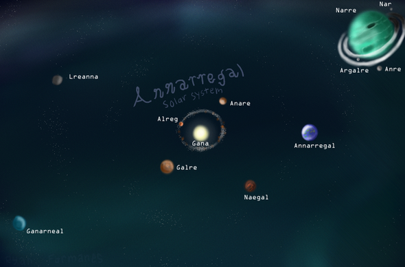 A map of the solar system for my Guardians of Anuur trilogy (world map here ). Made in Photoshop.You can probably tell I haven't named a lot of these worlds and moons so it's still a work in progress. I just wanted an idea of the number and types of planets in the night sky because the Ysindhi are big on astronomy. Most important are the sun, Anuur and its three moons, and the comet, but I'm sure they're at least aware of the rest and will have named them all.