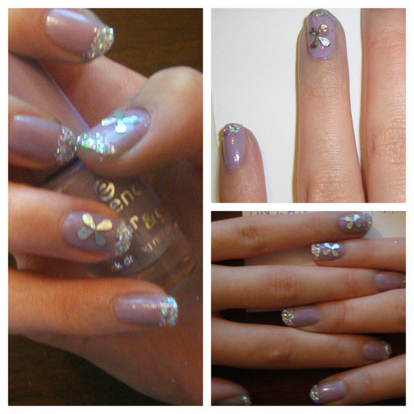 Ok, primero pintas las uñas del color que quieres, después tomas cinta y la pintas de color blanco (como se ve en la foto) luego recortas un rectángulo para que quede como una linea y al final la pegas en tu uña c: lo que se ve al final es un corazón y la ultima ya es el resultado (con brillo) Espero poder ayudarte