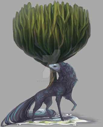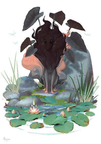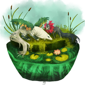 This background is so unique and cool! I love how the water looks like its made itself into its own little bowl. <3 The fur texture and all the painty aspect of the characters are really great, they work so well against the crispness of the background. :>