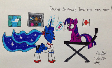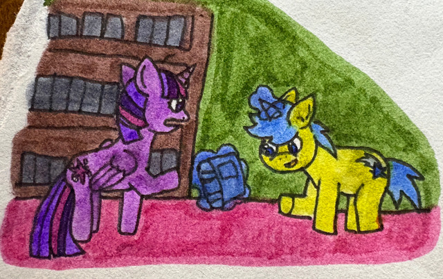 You are right on Starlight's coat: it's pink, because I have ran out of the correct ''lavender'' color, so I had to fall back on that color... Working in traditional it's not easy to get the right colors The ideal would be getting a 60-75 set of the Stabilo or Giottos, which I think I'll do as soon as I get this month paycheck.