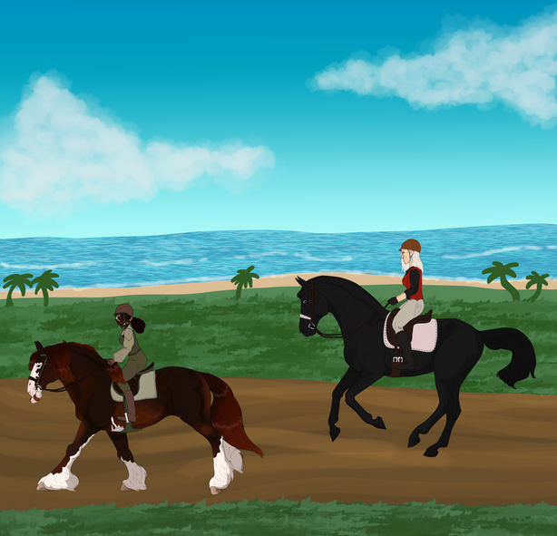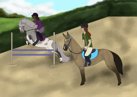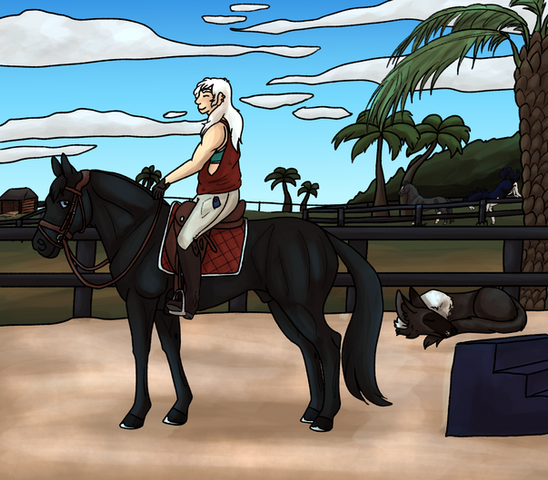 Sara headed out to the arena, heading around the barn to make sure it wasn't occupied. Katie was in there, warming up Sagaar before continuing his dressage training, and Sara's lesson was out there. One of the new riders, Linda, arrived a couple days previously and had asked the archangel for pointers while jumping. She had left early to tack up Drea, but from what Sara saw, she hadn't been on for very long. Deciding not to deal with a gate, she climbed over the fence and went to the middle of the arena, greeting both riders on her way. And with that, the lesson began.