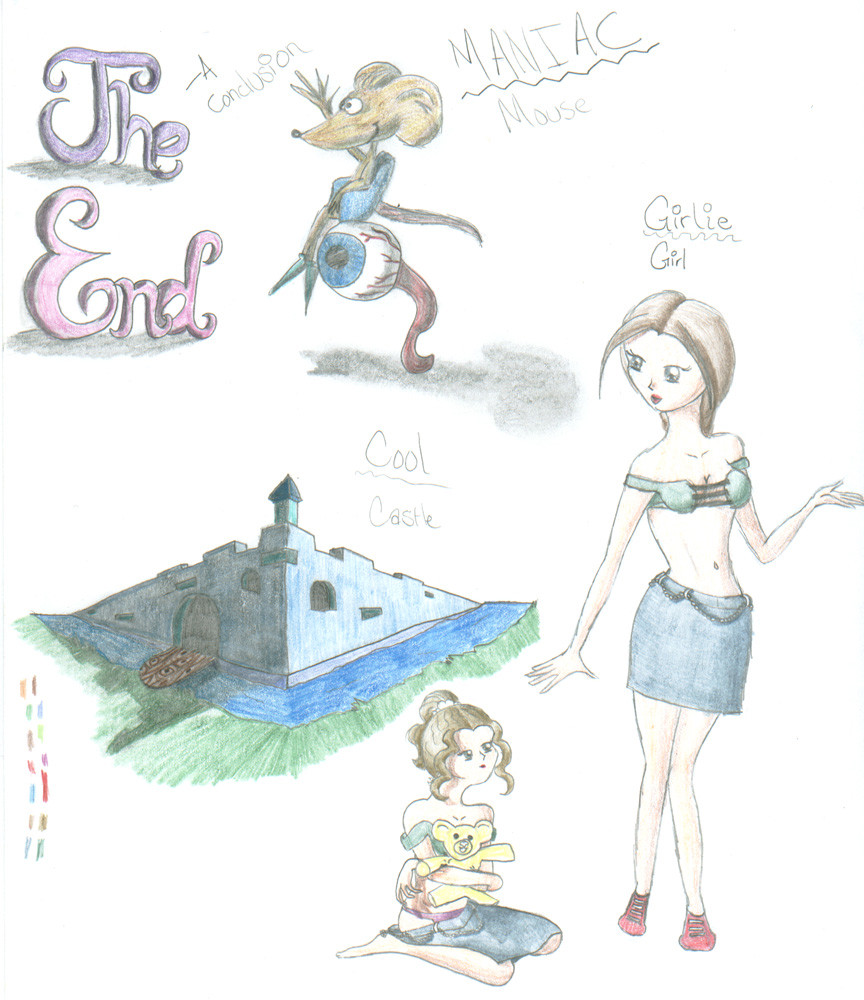A bunch of random sketches. I was bored and didn't know what to draw, so I ended up drawing random things. My favorite is the "The End". I asked my mom what I should draw and she said "Draw a conclusion", so I drew a conclusion. Then she said she never would've thought of that...anyways, the two girls are supposed to be sisters or something and the younger looks up to the older. The castle and the mouse came from watching waaaay too much imagination station when I was sick in 8th grade...colored with colored pencils. I'll scrap later if people think that I should.Related content
