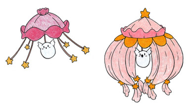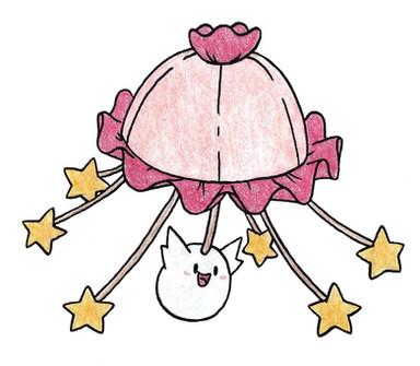Ok so here is the second fan/light pull I made, my baby mobile fake! When I first drew this fakemon I knew I had to make a pull of it, but I was always too lazy. So finally I decided to give it a go, I figured it'd be super easy, no problem, it was easy. BOY HOWDY was I wrong. It was hard to figure out the anatomy, is it an umbrella, is is a full body, how does the fabric ruffle, what does it actually look like?! I had to draw it up actually, took me a full day of drawing to figure out the answer to those questions. Then came the even harder part, I had to make it haha I was so lost, I just sat and stared at it for a while sometimes, it was just more thought provoking than I figured. It turned out...alright. In pictures, not bad, paint covered A LOT of mistakes, but in person it looks like a 4 year old made it lol It's really rough, and most likely I will trash it soon enough.So any hoozles, here you go, enjoy, don't make fun of me too much, and I also included my two pink babies together where they now sit dangling form my ceiling...watching me. OwO