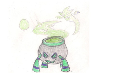 based off cauldrons and potions, Idk if they're related in any way to my potions, I just liked both and wanted to make both, so...enjoy!these pokemon produces a thick deadly poison that drips all around them and corrodes where it lands. They are very dangerous to hang around, but the poison is used in many ways for industrial needs. They have been around for ages, and there are many legends and folklore involving them. They can often be seen floating around in the moonlight with the thick poison bubbling around them.