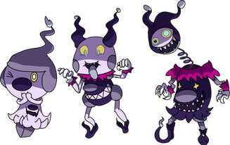 my puppet master, rabbit, harlequin/jester, marionette fakemonthese pokemon are lovers of the mysterious and trickery. they enjoy being around pokemon and humans, they love putting on shows and performing. after evolution though they tend to be controlling, often using their powers to control the bodies and minds of the feeble, forcing them to do their bidding, playing tricks on others, and often times stealing. when the final evolution's eye on its palms are open that means it is controlling someone around them.