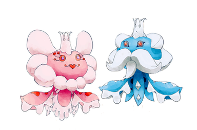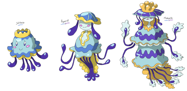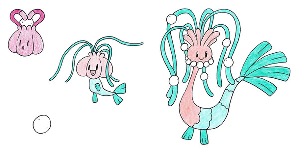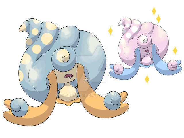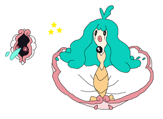 Based off clams, oysters, fountains, and The Birth of Venus. I wanted to make a "beautiful" pokemon that actually wasn't beautiful, but actually sort of goobery looking. I'm honestly not sure if I like this or not. I created the concept to uploading in 2 days I think, faster than I usually go, but I wanted to strike while I was in the mood. I can't decide if it's right or not. I do like it, idk.These pokemon are extremely narcissistic. It can be difficult in battle because it often thinks she is too good to battle their opponent, they also like to spend a lot of their time preening and grooming themselves. The first is a lot more easy going, but is often stubborn as well, usually squirting water into the face of their trainers for trying to force them to battle. The first live at the bottom of the ocean, while the evolution lives closer to the surface, often coming all the way up to sail in the currents. There are many legends told of them by lonely sailors at sea.