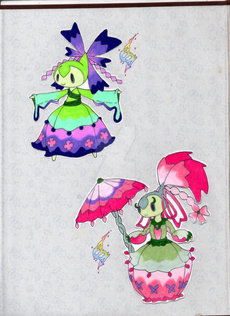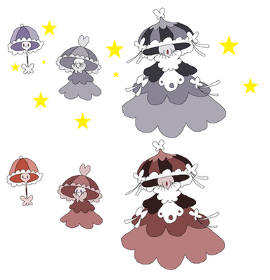 these are my victorian era parasol mademoiselle fakemonthese pokemon live in urban settings, they enjoy colder rainier locations. they are very sophisticated and classy pokemon, but fierce fighters in battle. they are very light wispy pokemon that are swept up even in light breezes. often times, especially in rain and storms, they clump together and are blown by the winds, people try to keep close to them and use their floating bodies for protection from the downpour. for a long time is was tradition to give a young woman this pokemon for their 16th birthday to help guide them into woman hood.