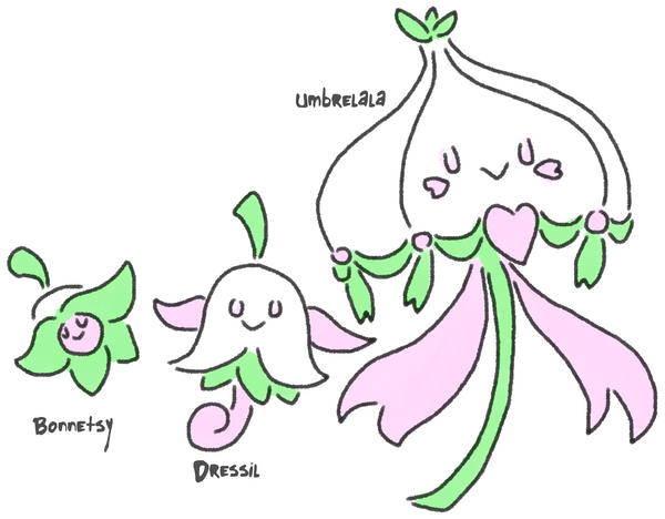 Stage 1: Primmella (Prim + Ella, a feminine name, + Umbrella = Primmella). Type: Normal/Flying. Dex Entry: "It enjoys getting a good soak. They especially like thunderstorms and dance about in the gales of wind."
