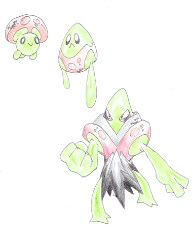 Stage 1: Wormeek (Worm + Meek = Wormeek). Type: Bug. Dex Entry: "It is rather timid and hides itself away in berries. Now, this tactic of hiding makes it rather rare and hard to find. Unfortunately there is a downside - an incident involving a poffin, for all their timid nature, did not end well at a village festival."
