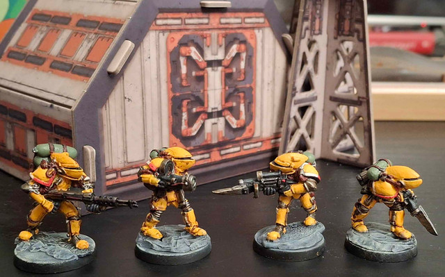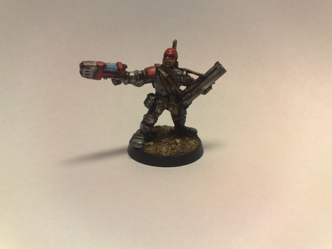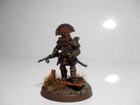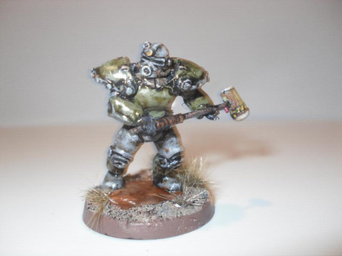 The models'a sligtly reposed Dust Tactics American soldier in Power Armour with a Brother Vinni head. Very little was done to emulate the in-game armour, whilst not looking strictly like it, the resemblance is close enough.