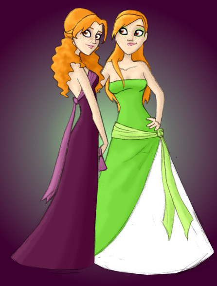 LIKE LEGIT THIS IS THE STORY: So this is Aubrey, in green, who is a *~princess~* turned ~*queen*~ but she's young and stupid and metally unstable or something and she wuvs her sister (thhis was at a time when I wasn't into girlxgirl, yet I made random one-sided girl love, and in this case - INCEST). Nora, her sister is the other girl who is all angsty and rebellious but hides it behind her fruity-pop bubbly personality. But she's exiled and can never see Aubrey again so poo.