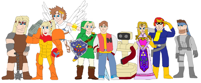 Link (Legend of Zelda 1+2), Fighter Hayabusa (Pro Wrestling), Hero of Time Twist, Takamaru (Nazo no Murasamejou), Anata (Famicom Tantei Club 1+2), Samus+Metroid (Metroid), Pit (Kid Icarus), Donbe (Shin Oni Ga Shima), Goku (Yuu Yuu Ki)