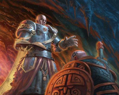 Here is my first job for Privateer Press.It's the Patriarch of Morrow blessing some Precursor Knights. It was much fun to paint these since I really like the Knights and their background.