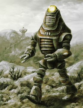 In this illustration first drawn on paper, I shade and highlight, then color my interpretation of a Sentry Bot. For more new stuff, subscribe now. Thanks for watching.