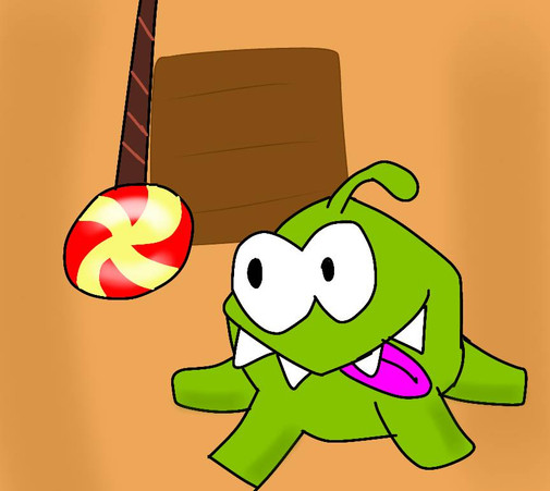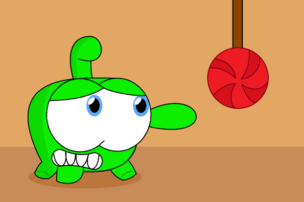 "Cut The Rope" The Famous App Video Game since 2010 next to Angry Birds!! The little cute green monster name On Nom can eating his favorite food: candy!!There are his 2 next video games: Cut the Rope: Experiments(2011)