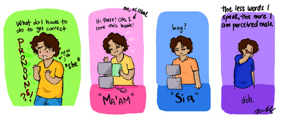 hahaha the thing at mcdonalds always happens to me >.<' I dont talk because i have suuuuch a light voice, i stay hunched because u cant bind them enough to be passable sitting up straight, so i go through all this trouble of ditching my habits and me friends/family still do that!!!!
