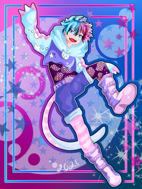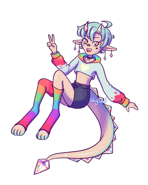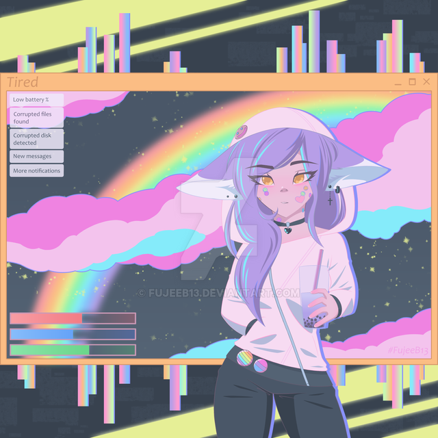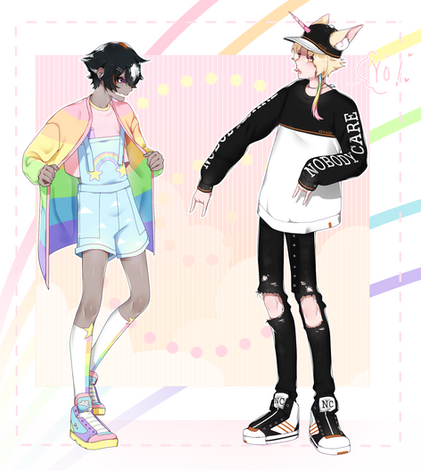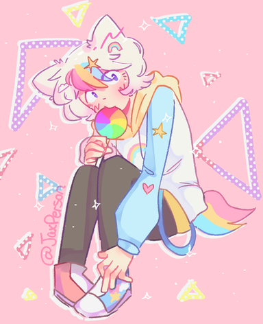 I decided to try out something new after seeing art of INPLICK as thumbnails on YouTube. I really liked the colors and aesthetic of them. Although, I didn't add all the stickers they have in their arts as I was never happy with them in mine.The colors were really fun to work with and very different from my bold and saturated colors. Here, they are more mute, but still very colorful. Of course, this was an occasion for me to have some fun drawing Rougalo with a softer face c: Also, it was a perfect drawing to bring back the rainbow hoodie outfit! As I really wanted to draw Rougalo with a snack, i searched for snack on a stick and stumbled onto the Korean corn dogs and OMG! I need to try one as soon as I get the chance to do so. They look so good!!! So Rougalo got one before me c':