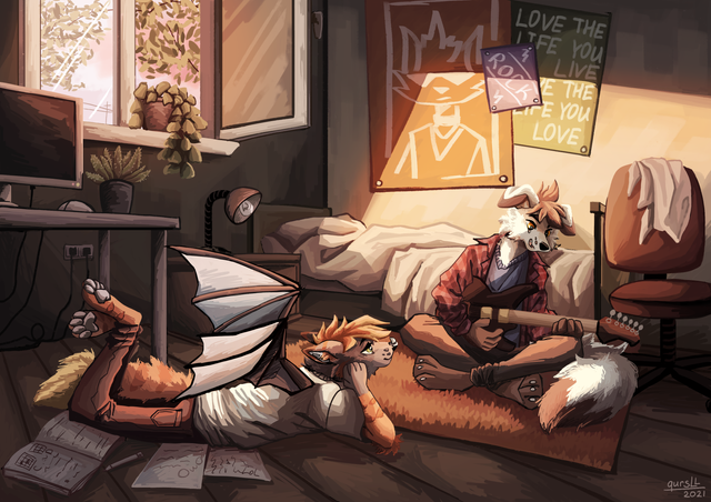 This is such a cute picture. I love how it shows them just lying on the floor and listening to music. It's so sweet. It makes me wish I had friends to spend time with. A very sweet picture, good job. c:
