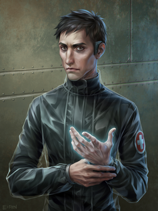 My least favorite of the 4 illustrations I did for Infinite Legends RPG [link] I invited my best friend Will over and we did a couple hours of photo shooting to get some refs for a few illustrations I was doing. That's actually me and Will used as a ref there. It was the first one I did from ref and I think I was too concerned getting everything right and was a slave to it. There was little thought to composition or anything like that, and the lighting situation is pretty boring, even though I was intentionally going for a sort of washed out doctors office look.I do, however, really like the depth of field effect (big thanks to the guys in the conceptart.org irc channel for giving me that idea.) and the tactical vest the soldier is wearing came out surprisingly well dispite the fact that I threw it on as an afterthought and it's minimally rendered.