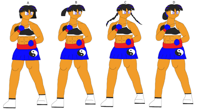 Her shoes have been replaced with these red boots, again, inspired by some seen in the Dragon Ball series. Specifically, Goku's boots during his training with Whis were the inspiration. They're red, just like the gloves. This not only compliments her purple gi, but also makes her fists and feet more easily readable.