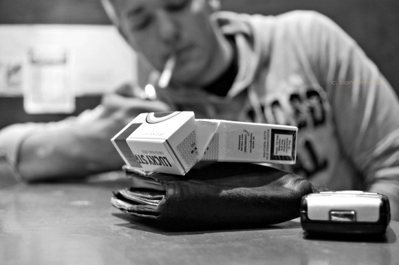 excellent shot. i love how the smoke from the cigarette merges with the steam from the coffee...