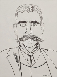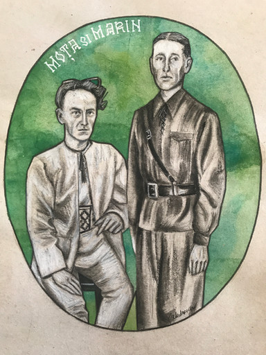 Portrait of Corneliu Zelea Codreanu, founder of the Iron Guard (Legion of the Archangel Michael), a fascist movement in 1927-41 Romania. Known for his fondness for religious mysthicism. Depicted wearing traditional romanian peasant dress.Pencil, black marker, charcoal, white crayon and white pen used.