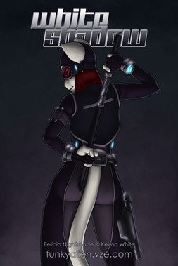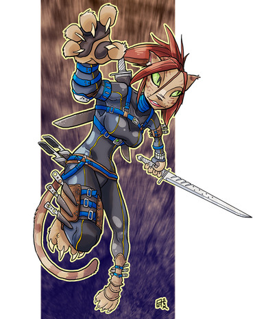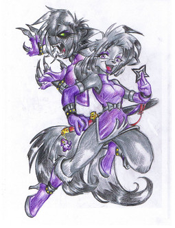 I believe this is the first fully coloured image of Violet I've done. She's Felicia Nightshade's rival - a match for her and terms of speed and skill, and a cold yet calculated psychopath.I had tried to colour this once before but I really hated it. I think it turned out much better this time around, although the light source is off. If you're wondering what that blue glow is by her ears, it's an electromagnetic chain on her ear rings.