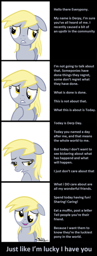 No lo pude haber dicho mejor respecto a la situación de Derpy y lo que paso con ella, ojala Hasbro no elimine su participación en futuros episodios.