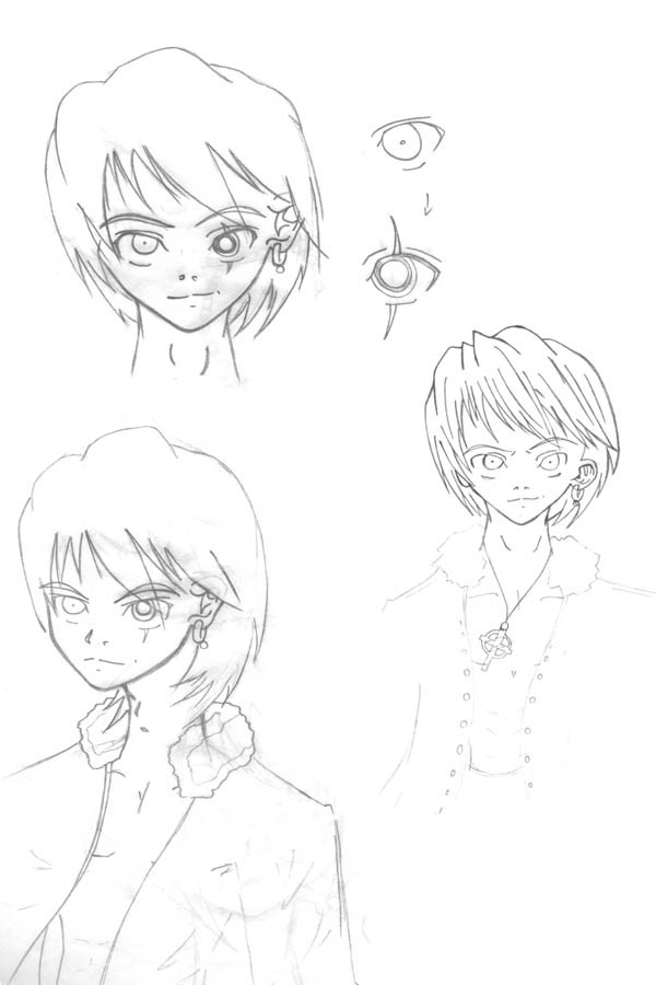 My character Xavier. Apologies for the messy page/scan.He's supposed to be a bit insane, and goes through some sort of accident and ends up with one twisted eye. Wears a fur jacket ^.^