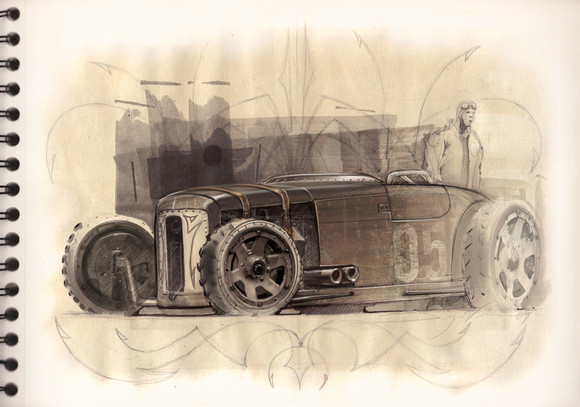 Great sketching style! Concept is very cool (as long as he never needs to back out of a sloped driveway). (...'course the rear fenders could have little piston jobs in them...)