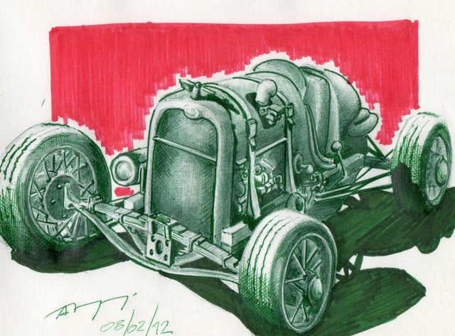 This was a print done for Grand National Roadster show. It is the Hot Rod featured on the front of The Hot Rod Art Book: masters of chicken scratch book . I sell them in my store for $10 at www.dwaynevanceart.comIt is printed on silver heavy card stock. I took my love for Hot Rods and WWII aircraft and created this design. It would be a car you would see on the Salt Flats or trying to break speed records.
