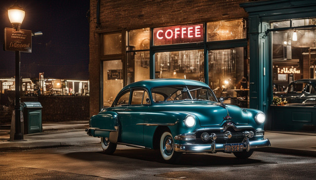 This image features a vintage car that seems to be a Chevrolet Chevelle, a prominent model during the muscle car era of the late 1960s and early 1970s. The car is characterized by its long, straight body, distinct front grille, and quad headlamp setup.The scene is an urban street at what appears to be either sunrise or sunset, given the golden hue of the light that bathes the buildings and the car itself. The ambiance is calm and evokes a sense of nostalgia, with the warm lighting adding to the vintage feel of the setting. The car is parked outside of a café or restaurant, with its interior lights offering a welcoming glow, inviting passersby to step in and enjoy the ambiance.