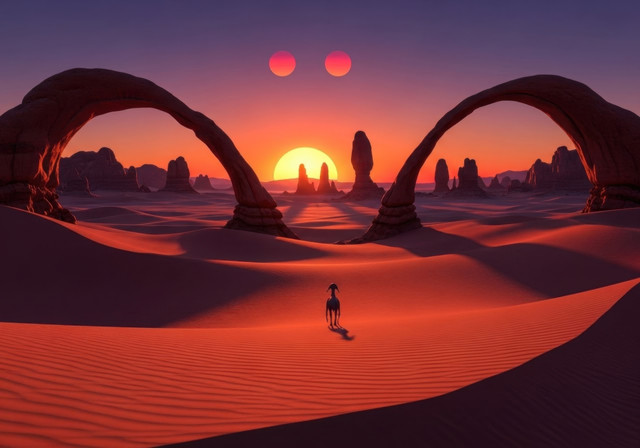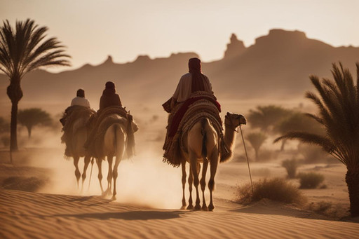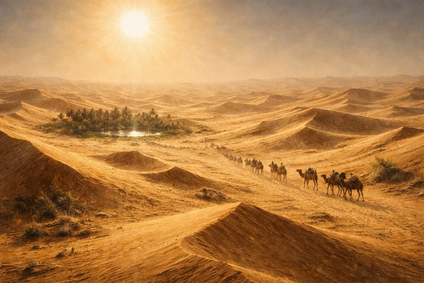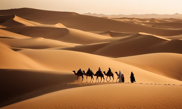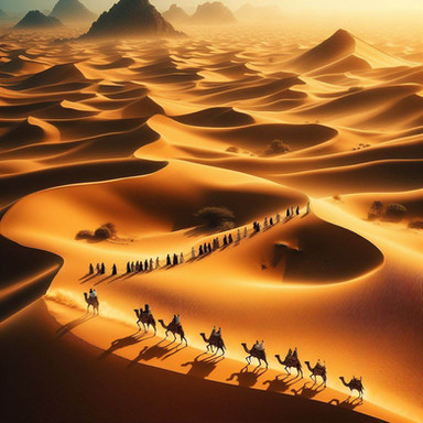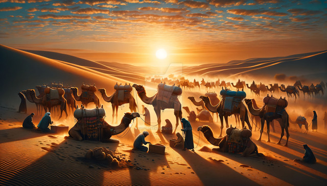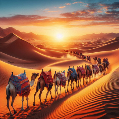 The desert, expansive and seemingly unending, beckons the caravan into its embrace.