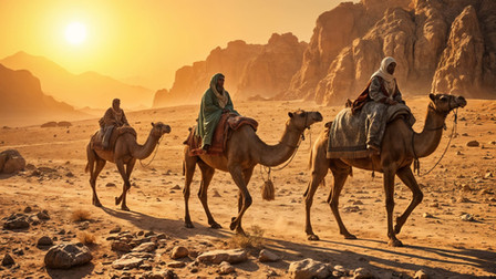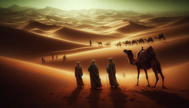 The caravan presses on amidst the silence of the desert, their busy feet rustling the sand as the tinkling bells vibrate upon the stillness of the desert air.Bathed in the early morning light, the long shadows cast by the camels and their drivers accentuate the daunting journey that lies ahead. The desert, expansive and seemingly unending, beckons the caravan into its embrace.
