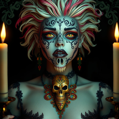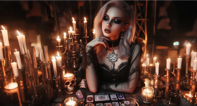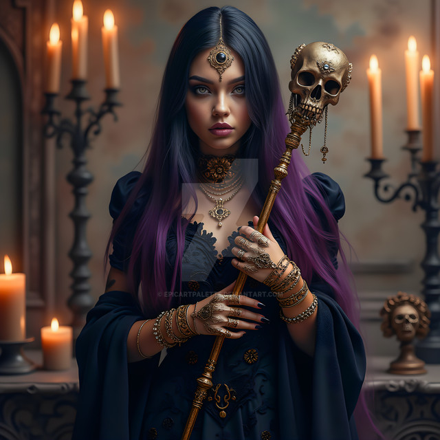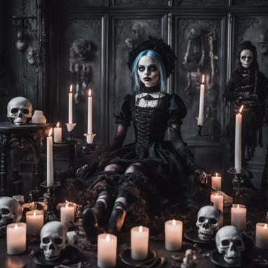 Breakfast is a ritual in itself, where each sip of her herbal tea is a silent prayer to the earth, a plea for strength and clarity. As she steps out into the world, her attireβa tapestry of black velvet and lace, adorned with crystals and amuletsβserves as armor against unseen forces and the judgmental glances of those who cannot understand her path.
