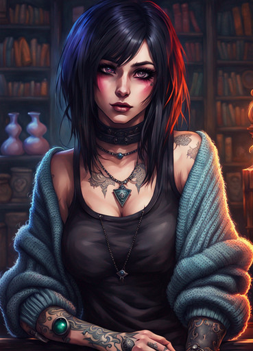 Her days are spent in the pursuit of knowledge and power, visiting mystical shops hidden in the city's forgotten corners, where she seeks new trinkets and talismans to aid her in rituals meant to cleanse her soul and protect her from her demons.