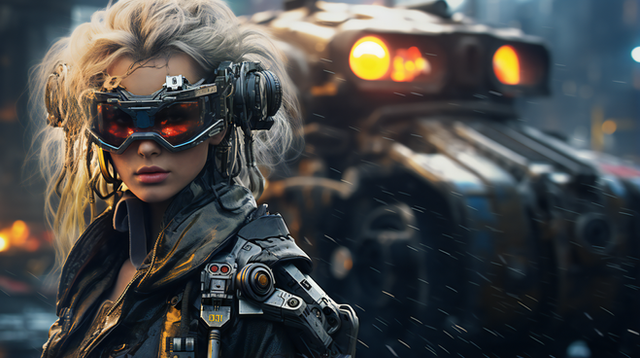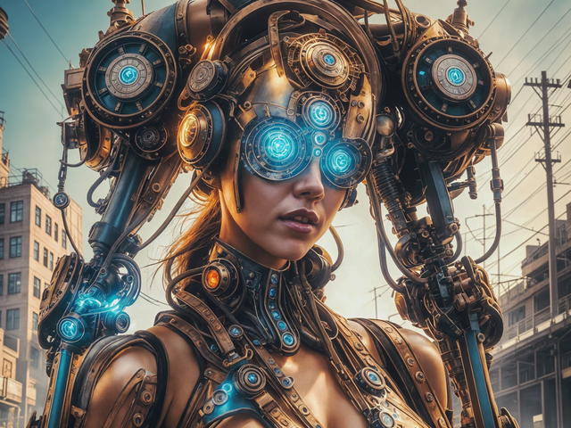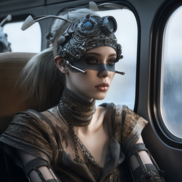 The train carriage was bustling with activity as it sped through the countryside. In the midst of the crowd sat a slightly augmented woman, her eyes darting nervously around the carriage. Beside her sat an automaton, its metallic body gleaming in the sunlight.