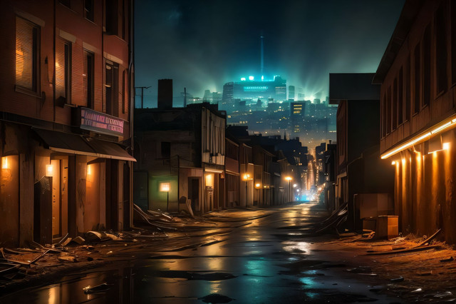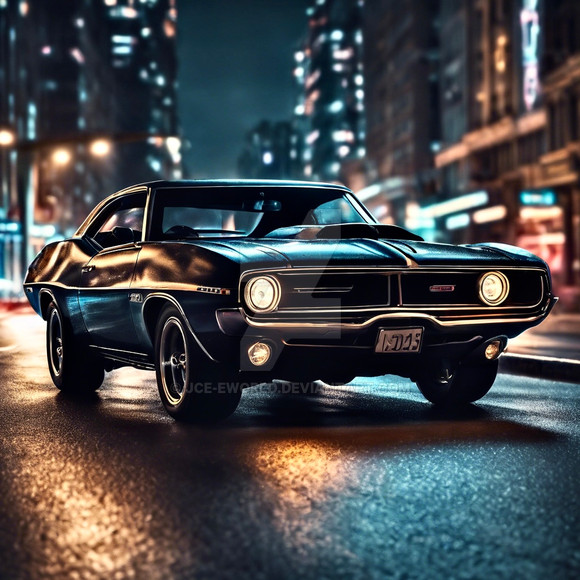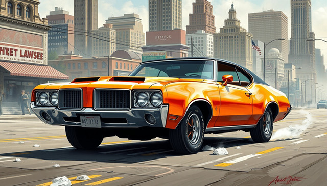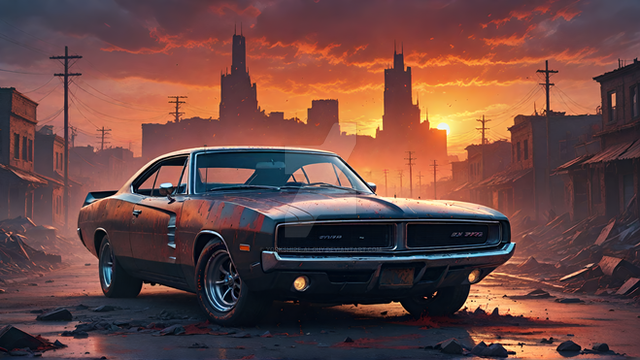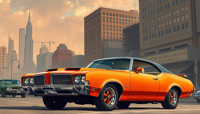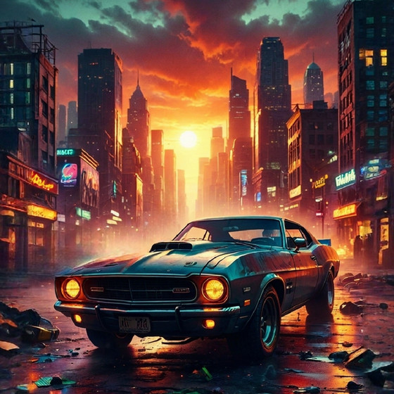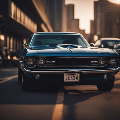 A muscle car from the late 1960s to early 1970s, likely an AMC Javelin or a similar model. These cars were known for their powerful engines and sporty design, aimed at a young demographic looking for performance and style. The Javelin, with its long hood, short deck profile, and distinctive racing stripes, was a notable competitor in the muscle car market during that era.The setting is an urban street bathed in the warm, soft light of a setting or rising sun, which suggests either the beginning of a new day or the calm of the early evening. The environment has a vintage feel, evocative of the same era as the car, hinting at a time when these vehicles ruled the road. The golden hour light casts a nostalgic glow over the scene, highlighting the car's sleek lines and chrome details, making it a perfect moment frozen in time, celebrating the legacy of American automotive design.
