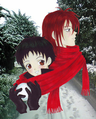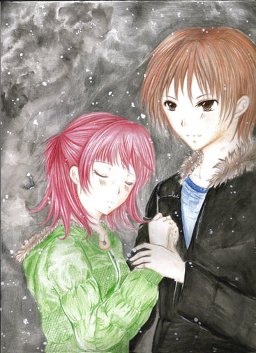 This is one of the first Aki/FeMC pairing drawings I did in my sketchbook, so I'm sure there's a lot of errors. (For instance, his pants are tan, not BLACK.) The colors ended up kinda wonky in the scanner, so the tan color doesn't look as good as it does on paper.While I was scanning this awhile ago, my hair got stuck to my lollipop.