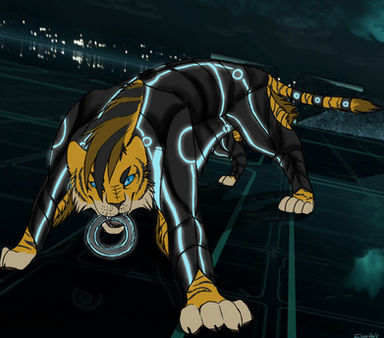Looks very neat, I love how this was executed. The fur detailing is wonderful. The shine and glow are perfect and not overly used. The gaps in legs are quite a unique thing. I've never seen it before. The background could possibly use a little more touching up, but then again, its not the main focus of the piece. The visor on the "Tron" aspect possibly could have been clear perhaps? I'm just saying because they were clear in the movie. The IDD could have been made more of a "solid" looking piece, it looks like its blending in with the honeycomb data? Also I'm not sure if you can do animations, but the IDD spinning could have been neat. But overall I like this piece.