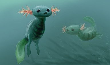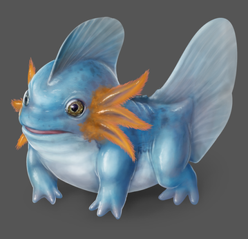 For those interested, I based it mostly off of an axolotl, which is probably most noticable in the head and external gills. Due to its length, I based its stance more on a frog than an axolotl, and I used salamander references for the skin. The fins are based on the caudal fins of fish.