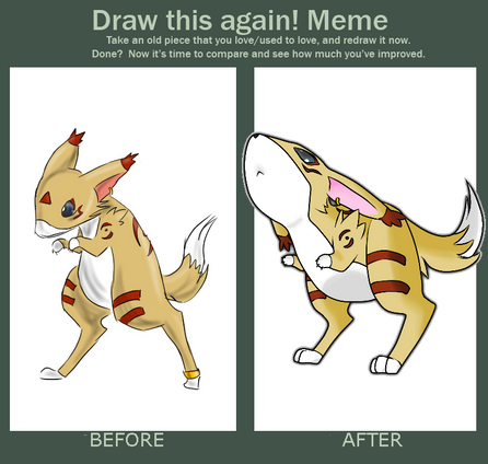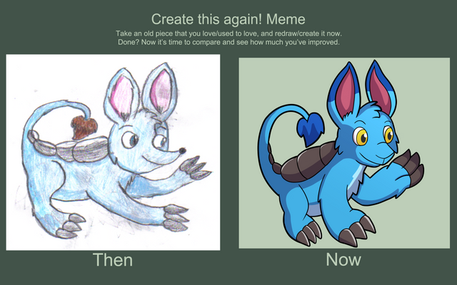 So... she hasn't changed very much has she? She's changed the most in that she has actual anatomy now. I used to draw her like a Pokemon - lots of details that needed to be the same every time, body parts that made no logical sense, etc. Now though, she has real ears, a tail, paws, etc. Besides a few other minor things, that's all I really changed. She still looks completely absurd but I guess I like her that way~