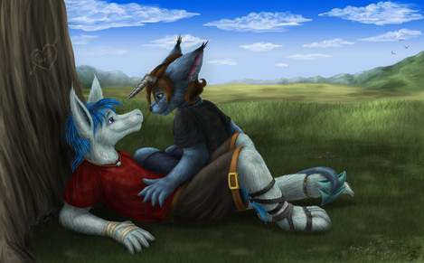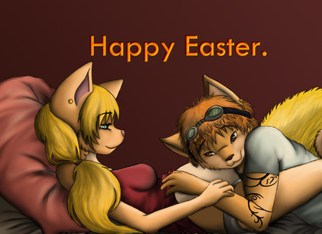 This started as a doodle on my tablet, and eventually I spent just enough time on it that I couldn't throw it out. I went for a different kind of style this time, with no outlines, and an abstract background. The image is of me and my bunnyRelated content