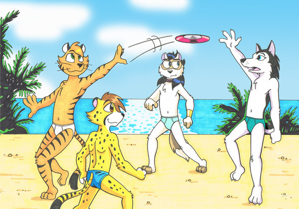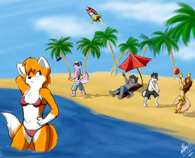 This picture some potential. You paint an impressive view from the beach out to the horizon, with a believable gradient in the water and lush clouds. The characters are drawn well enough, but I'm afraid the overall presentation falls short. The painting is sorely lacking in effects that enhance the feel of the scene. For starters, the tide looks fake. There are no waves to suggest the water is even moving, so why would there be foam? Can you explain the physics how Fox and co. can run across a beach without leaving any footprints or kicking up any sand? Even the shadows are missing! How could you forget that? Speaking of shadows, there are no lighting effects like sun rays or tinted colours to set the tone. Even the vegetation in the foreground looks paltry and redundant.