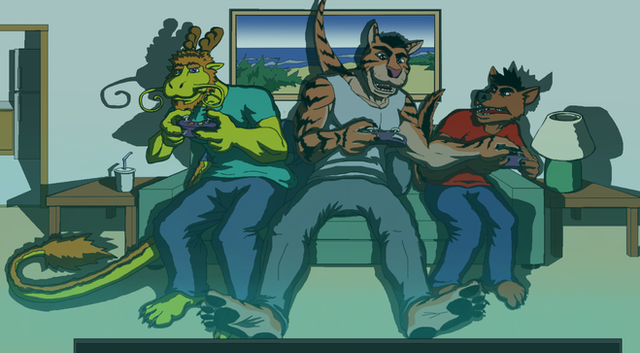 On the couch theres Yugo, Talbain, and a Worgen.