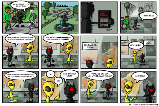 It's still funny, but the whole "let's find people who can help us out!" thing has taken up way too many strips imo..